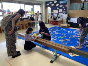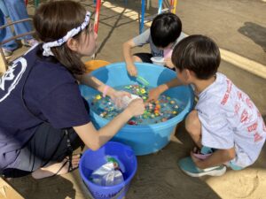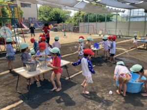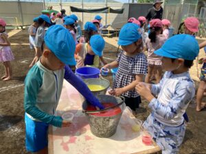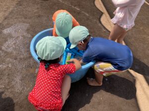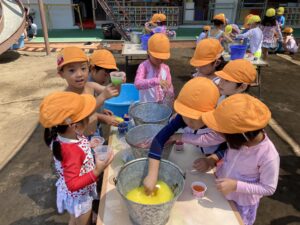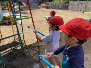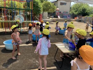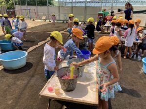 8月の夏季保育1日目は水遊び!色水やシャボン玉、水鉄砲で夏ならではの遊びを楽しみました!