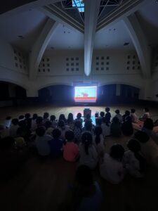今年は【上郷森の家】でお泊まり会を行いました。まず、港南台にある「子ども宇宙科学館」でプラネタリウムを見た後に、上郷森の家にむかい、外で宝探しをして見つけた宝物の水鉄砲やシャボン玉で遊んだり、クーラーのきいた涼しいお部屋でバルーンをして遊んだり、キャンプファイヤーをしたり…と1泊2日、目一杯遊んでくることが出来ました!