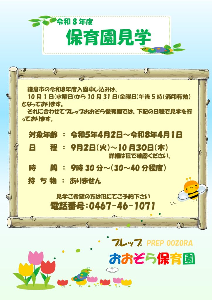令和8年度入園に向けての見学ですが、鎌倉市保育所等の入所申し込み締切日(10/31・金)に合わせて9月2日~10月31日までとなります。