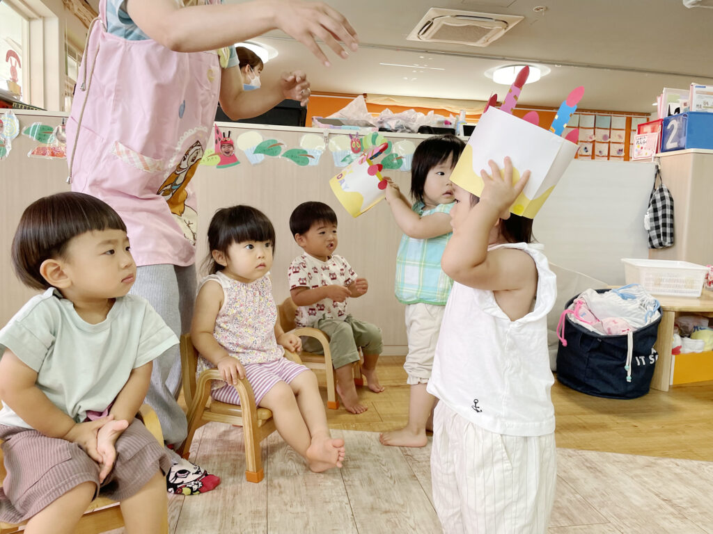 延長児は、夕食に響かない量のお菓子を食べ、動くプラレールや豆自動車など少人数ならではのおもちゃで楽しみます。