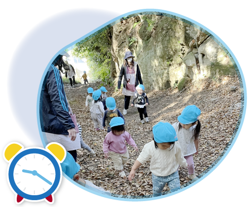 2歳児までの保育園で、定員も45名と少ないため、ゆったりとした保育園です。園周辺も緑豊かで、日課のお散歩も大小さまざまな公園や裏山、切通に出かけることができ、自然の恵みの中で、多くの体験を積むことができます。