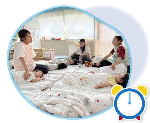 お昼寝は室温、湿度の調整に心がけ、午前の疲れが取れるようゆったりと休める環境にしております。