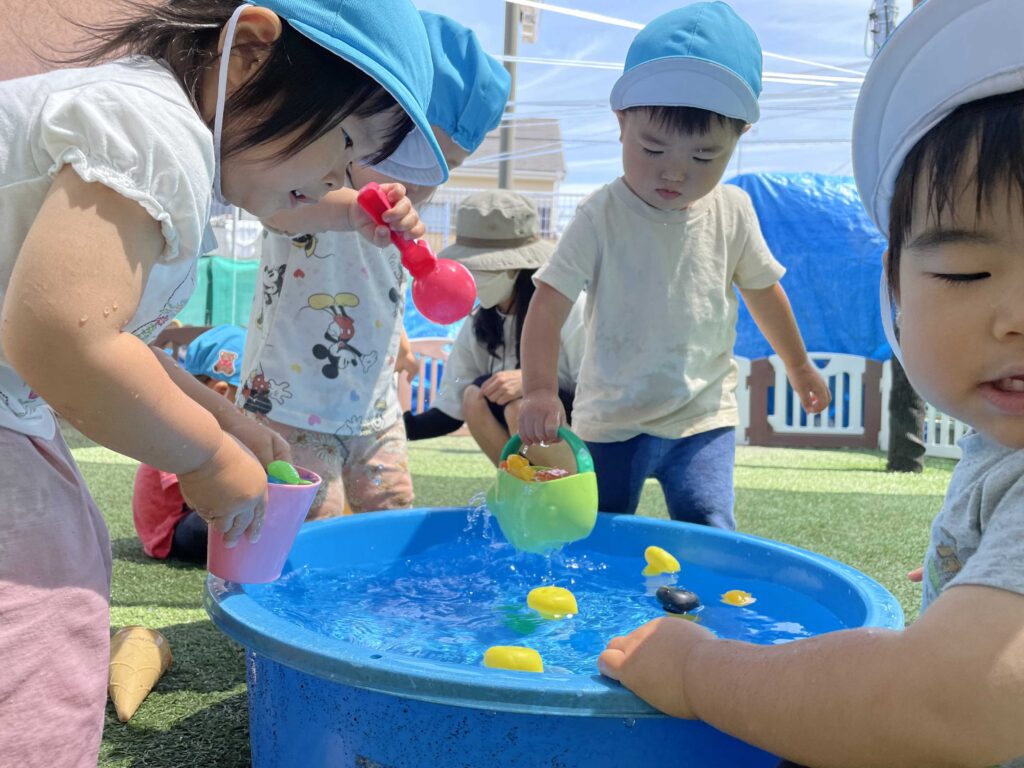 夏は、園庭にタープを張って水遊びやプール遊びを楽しみます。